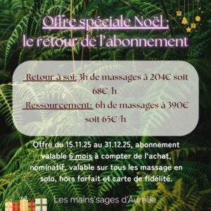 La régularité dans vos séances de massages est la clé de l’amélioration de votre capital bien-être. Plus vous prenez soin de vous régulièrement et plus le tarif est avantageux!